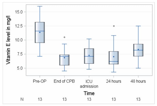 Perioperative course of vitamin E. CPB, cardiopulmonary bypass; ICU, intensive care unit; N, number of patients. Circles represent outliers.