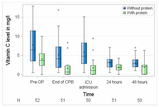 Regarding the clinical outcome of the patients, no significant association with vitamin C levels were observed in this observational explorative study, beside the non-significant postoperative higher SOFA score in patients with preoperative suboptimal vitamin C status. In fact, we acknowledge that it is challenging to detect clinically meaningful and measurable associations in low-risk patients and small cohort, who are frequently discharged early after 1–2 days and reflected by the rare occurrence of organ dysfunction, short ICU and hospital length-of-stays, and 30-day mortality [37,38]. These elective patients undergoing mostly low-risk open-heart surgery are expected to rapidly recover after surgery and often stay in the ICU for one night only, irrespective of any additional treatment. These patients might also be normally nourished before and after surgery, allowing for adequate supply of macro- and micronutrients. In contrast, patients undergoing more complex heart surgeries, for example, combined cardiopulmonary artery bypass graft and valve surgery or patients receiving a ventricular assist device have an increased risk for longer surgeries and CPB-times, as well as prolonged recoveries. These patients, as well as patients with preoperative malnutrition might be more susceptible for malnutrition and perioperative vitamin deficits, which deserves further investigation.