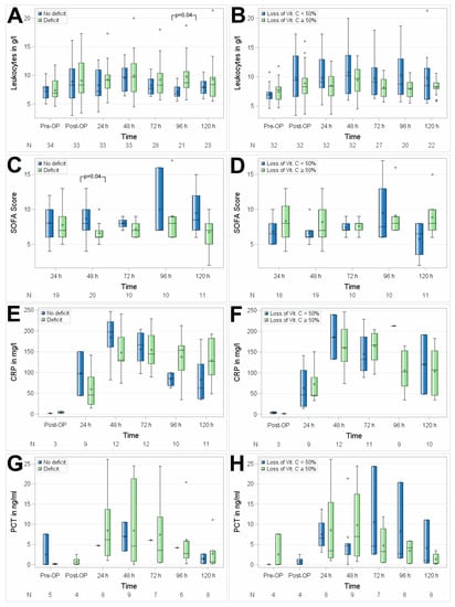 Association of perioperative vitamin C levels with leukocytes (A,B), SOFA Score (C,D), CRP (E,F), and PCT (G,H). N, number of patients; (A,C,E,G) patients with preoperative vitamin C deficit; (B,D,F,H) patients with intraoperative loss of vitamin C ≥ 50%. Circles represent outliers.