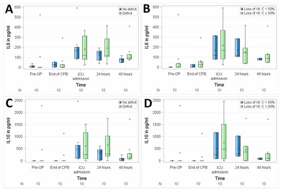 Association of perioperative vitamin C levels with interleukin 6 (IL6) (A,B) and interleukin 10 (IL10) (C,D). N, number of patients; (A,C), patients with preoperative vitamin C deficit; (B,D), patients with intraoperative loss of vitamin C ≥ 50%. Circles represent outliers.