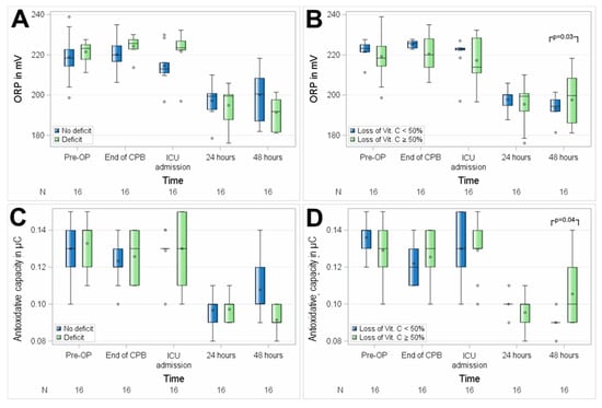 Association of perioperative vitamin C levels with oxidative stress, assessed as oxidation–reduction potential (ORP) (A,B) and anti-oxidative capacity (C,D). N, number of patients; (A,C), patients with preoperative vitamin C deficit; (B,D), patients with intraoperative loss of vitamin C ≥ 50%. Circles represent outliers.