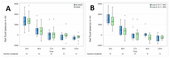 Association of perioperative vitamin C levels with fluid balance. (A) Patients with preoperative vitamin C deficit and (B) patients with intraoperative loss of vitamin C ≥ 50%. N, number of patients. Circles represent outliers.
