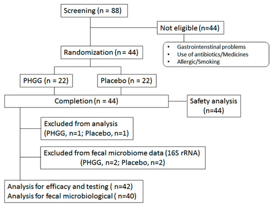 This study was performed from January–June 2018. Eighty-eight volunteers were initially screened (Figure 2). According to the described inclusion/exclusion criterion, 44 were excluded from the study due to lower stool consistency scores and non-consistent parameters. The finally selected 44 volunteers were randomly allocated into the groups to receive PHGG or the placebo.