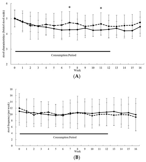 Effect of PHGG on primary endpoints. Stool form (A) and frequency (B) are shown. Straight lines and dotted lines denote mean values for PHGG and placebo groups, respectively. Bars show SD. PHGG group: n = 21, placebo group: n = 21. * p < 0.05, Welch’s t-test.