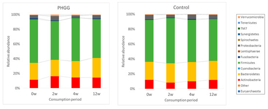 Comparative analyses of the taxonomic composition of the microbial community at the phylum level for each group at each consumption period. Each component of the cumulative bar chart indicates a phylum.