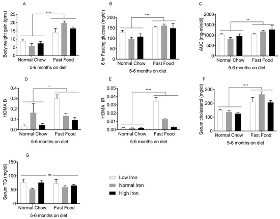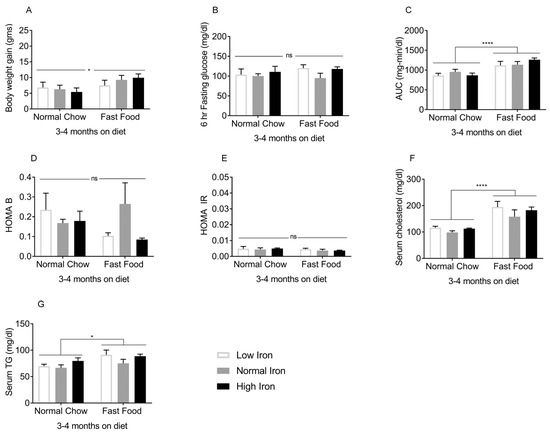 The effects of FF began to be manifest 3–4 months after initiation of the diets. At this time, mice on FF were heavier compared to those on normal chow (NC) (Figure 1A). Although fasting glucose values did not differ (Figure 1B), the area under the glucose curve (AUC) during intraperitoneal glucose tolerance testing was higher in the FF group overall, though only the high iron (HI) FF group differed significantly from the corresponding NC group (Figure 1C). Beta cell function and insulin resistance as estimated by the homeostasis model assessment (HOMA-B/IR) were not statistically different among the groups (Figure 1D,E). Serum cholesterol (Figure 1F) and serum triglycerides (TG) (Figure 1G) were higher in the FF diet groups. Thus, after 3–4 months on the diets, the effects of FF on weight and glycemia were modest, and insulin resistance was not yet established. After 5–6 months on the diets, the FF groups demonstrated further body weight gain (Figure 2A), higher fasting glucose values (Figure 2B), and an increased AUC (Figure 2C). Higher HOMA-B in the FF group reflected hyperinsulinemia, which diminished at higher iron (Figure 2D). HOMA-IR values were also higher in the FF group, and this too diminished in the HIFF group (Figure 2E). Similar to 3–4 months, the FF group exhibited hypercholesterolemia, although serum TG remained largely unaffected by either diet or iron (Figure 2F,G).