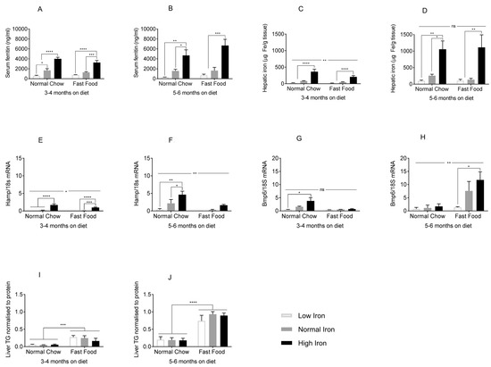 Effects of the FF diet on iron parameters and of dietary iron on hepatic lipid accumulation. (A,B) Serum ferritin at 3–4 and 5–6 months (n = 3–5 per group). (C,D) Hepatic iron content at 3–4 and 5–6 months (n = 3–6 per group). (E,F) Hepcidin mRNA (Hamp) normalized to 18s rRNA at 3–4 and 5–6 months (n = 3–5 per group). (G,H) Bone morphogenetic protein 6 (Bmp6) mRNA at 3–4 and 5–6 months (n = 3–5 per group). (I,J) Liver triglyceride content (TG) at 3–4 and 5–6 months (n = 3–10 per group). Shown are means ± SE. p values were calculated by two-way ANOVA with post hoc Tukey’s multiple comparisons test. ns: not significant, i.e., p ≥ 0.05; * 0.01 ≤ p ≤ 0.05; ** 0.001 ≤ p ≤ 0.01; *** 0.0001 ≤ p ≤ 0.001; **** p < 0.0001.