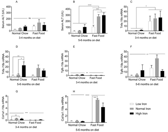 Effects of dietary iron and FF on NASH biomarkers: (A,B) Serum ALT at 3–4 and 5–6 months (n = 3–11 per group). (C,D) Tumor necrosis factor alpha (Tnfa) mRNA at 3–4 and 5–6 months (n = 3–5 per group). (E,F) Transforming growth factor beta (Tgfb) mRNA at 3–4 and 5–6 months (n = 3–5 per group). (G,H) of collagen1alpha1 (Col1a1) mRNA at 3–4 and 5–6 months (n = 3–5 per group). All genes were normalized to 18sRNA. Shown are means ± SE. p values were calculated with ordinary two-way ANOVA with post hoc Tukey’s multiple comparisons test. ns: not significant, i.e., p ≥ 0.05; * 0.01 ≤ p ≤ 0.05; ** 0.001 ≤ p ≤ 0.01; *** 0.0001 ≤ p ≤ 0.001; **** p < 0.0001.