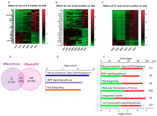 Transcriptome profiling by RNA sequencing revealed that the expression of multiple genes is altered by dietary iron (Figure 5A,B). To analyze differential gene expression, we chose the LIFF and HIFF groups that differed in terms of hepatic inflammation and fibrosis. We generated a dataset of DEGs that exhibited at least two fold changes in expression, significant at p < 0.05 after adjustment for false discovery. Pathways with false discovery rates >10 were not considered, even with low p values. Pathway enrichment analysis using DAVIDv6.8 identified a single Kyoto Encyclopedia of Genes and Genomes (KEGG) pathway (mmu04350: TGF-β signaling pathway) as significantly enriched, at both 3–4 months and 5–6 months (Table S1).