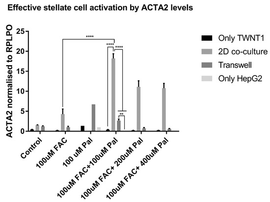Hepatocyte-stellate cell interaction is necessary for iron- and fat-induced fibrogenesis: mRNA expression of smooth muscle actin (ACTA2), upon treatment with iron (FAC) and palmitate (Pal). n = 3 biological replicates. Error bars are shown as means ± SE. p values were calculated by two-way ANOVA with post hoc Tukey’s multiple comparisons test. ** 0.001 ≤ p ≤ 0.01; **** p < 0.0001.