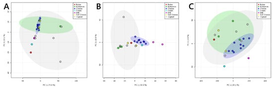 PCAs of samples of fresh and fermented dairy samples used in the present study. Panel (A), PCA of signals of dairy samples collected in positive ion mode; (B), PCA of signals of dairy samples collected in negative ion mode; (C), PCA of signals of fatty acids from dairy samples collected in negative ion mode with collision/induced dissociation. 95% probability boundaries for yoghurt (grey), buttermilk (green) and cheese (dark blue) are shown.