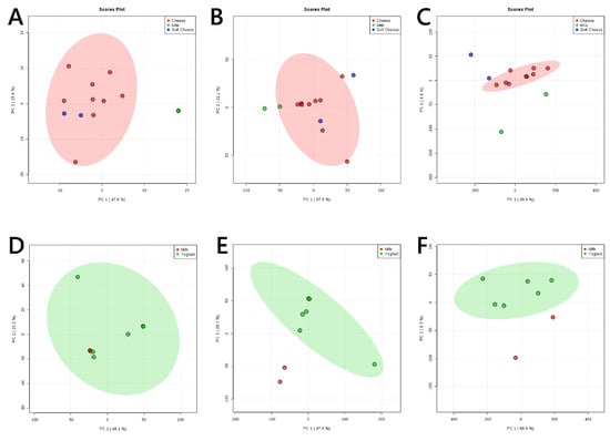 Principal component analyses of sampls of milk with soft and matured cheeses, and yoghurt. Panel (A), positive ionisation mode (99% glycerides); (B), negative ion mode (>85% phospholipids); (C), negative ionisation mode (fatty acids only). Principal component analyses of samples of milk with yoghurt. Panel (D), positive ionisation mode (99% glycerides); (E), negative ion mode (>85% phospholipids); (F), negative ionisation mode (fatty acids only). 95% probability boundaries for cheese (red, panels A–C) and yoghurt (green, panels D–F) shown.