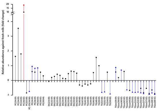 Furthermore, we also note that the most abundant isoforms of phosphatidylcholine (PC) and phosphatidylethanolamine (PE) in mammalian samples such as milk are more than 50% more abundant in cheese than in milk (Figure 3). The increase in abundance of PC may be ascribed to a combination of the inability of bacterial and/or fungal cells to absorb and/or metabolise it and the concentration effect of the fermentation. PC(34:01) and PC(36:02) are amongst the most abundant in fresh animal milk, as are isoforms of PE are 34:01, 36:01, and 38:02 []. As bacteria do not typically produce PC de novo, the increase in the abundance of PCs with respect to milk indicates that fermentation has a concentrating effect on the lipid fraction. This is consistent with the percentage of fat in milk with respect to yoghurts (up to 10%) and mature cheeses (30%–40%).