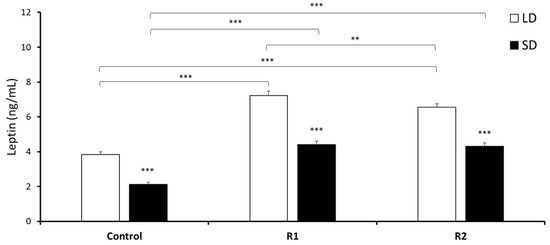Plasma leptin concentrations. Mean circulating concentrations (±SEM) of leptin in saline- and recombinant bovine resistin-treated groups (R1—low dose and R2—high dose) during the long-day (LD) and short-day (SD) photoperiods. Differences relative to the control or between the other groups are indicated with ** P < 0.01 or *** P < 0.001.