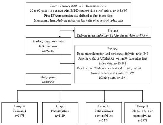 We identified 103,646 patients 20–90 years old with an ESRD certification between January 2005 and December 2010. After excluding the patients with dialysis initiation before the ESA prescription, renal transplantation, and peritoneal dialysis, patients without the ACEI/ARB prescription, and patients who died within 90 days of the first index date, patients with cancer, and those with missing data, the remaining 10,954 individuals were enrolled in the study group. The patients were grouped according to the medication prescribed (Figure 1). Group A (n = 5073) received folic acid, group B (n = 1119) received pentoxifylline, group C (n = 2184) received both folic acid and pentoxifylline, and group D (n = 2578) received neither of those medications.