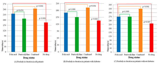 Comparisons of the predialysis duration among drug groups in patients with and without diabetes. (A) Predialysis duration in all patients, (B) Predialysis duration in patients with diabetes, (C) Predialysis duration in patients without diabetes.