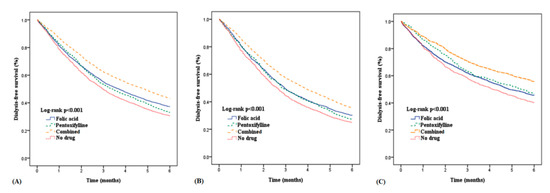The times from the first index date to the second index date for the groups are plotted in Figure 2A. Further evaluation of the outcomes of patients with and without diabetes is presented in Table 3. Figure 2B,C show the different effects of medication on the duration from the ESA start to the initiation of chronic hemodialysis for patients with and without diabetes. The delay of dialysis for patients with diabetes was shorter than that of patients without diabetes. The Kaplan–Meier analysis with the log-rank test, which presents dialysis-free survival within six months, is shown in Figure 3. Folic acid and pentoxifylline, separately and together, delayed the need for dialysis.