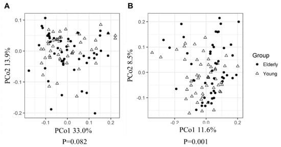 Baseline principle coordinate analysis (PCoA) plots based on weighted UniFrac (A) and unweighted UniFrac (B) pairwise distance matrices using amplicon sequence variant-level data, show overlapping microbiota profiles of young adults and elderly. Significance of observed differences between groups was evaluated by PERMANOVA.