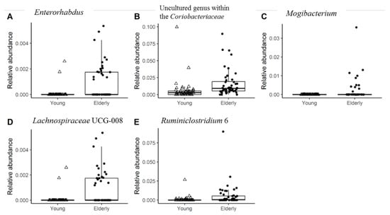 Genus level taxa that significantly differed (false discovery rate (FDR) < 0.05) in relative abundance between young adults and elderly at baseline. The relative abundance of each genera are shown as follows, (A) Enterorhabdus; (B) Uncultured genus within the Coriobacteriaceae; (C) Mogibacterium; (D) Lachnospiraceae UCG-008; (E) Ruminiclostridium 6.