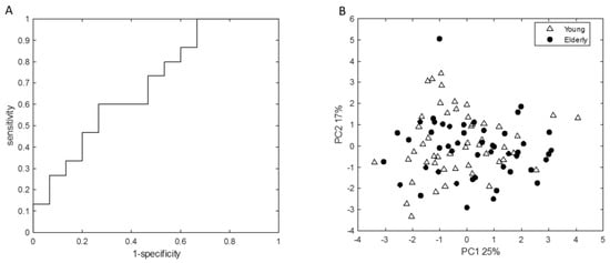 (A) Receiver operating characteristic curve performed on the validation set, with area under the curve = 0.70. (B) Principal Component Analysis (PCA) score plot, performed on a set of 15 VOCs that were found important (set of the most discriminatory volatile organic compounds (VOCs) selected in at least 80% of RF iterations) for classification in the Random Forest (RF) model, showing no clear groupings in exhaled breath profiles between young adults and elderly. Percentages given at both axes indicate percentage of variation explained by either principal component.