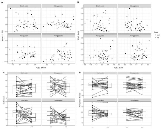 Intervention effects on microbiota composition and alpha diversity in young adults and elderly. PCoA plots at baseline and after four weeks sugar beet pectin or placebo supplementation based on weighted UniFrac (A) and unweighted UniFrac (B), showed no clear groupings in microbiota profiles between pre- and post-intervention. (C) Comparison of phylogenetic diversity and (D) InvSimpson indices pre- vs. post-intervention at individual level, showing no significant changes in microbial diversity pre- vs. post-intervention. Significance of differences between groups was evaluated by PERMANOVA.