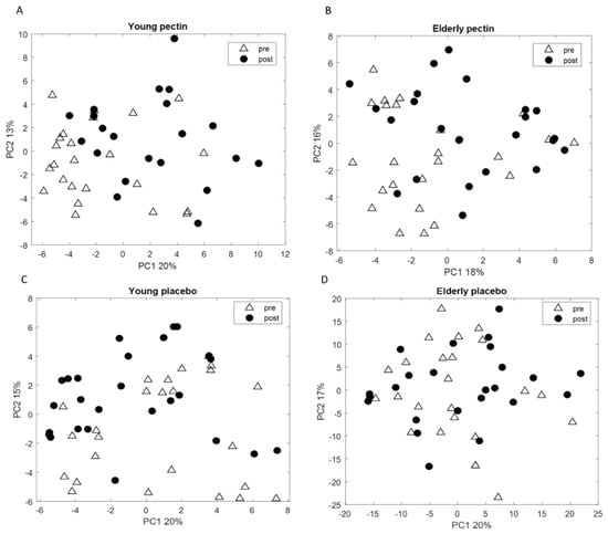 PCA score plot based on the set of (A) 11 volatile metabolites in the exhaled breath of young adults to discriminate between pre and post-pectin intervention; (B) 12 volatile metabolites in the exhaled breath of elderly to discriminate between pre and post-pectin intervention. PCA score plots performed on the set of 14 VOCs measured in exhaled breath of (C) young adults; and on 16 VOCs measured in exhaled breath of (D) elderly; for pre- and post-placebo intervention. No groupings of the samples are observed. Discriminatory VOCs were selected in at least 80% of RF iterations.