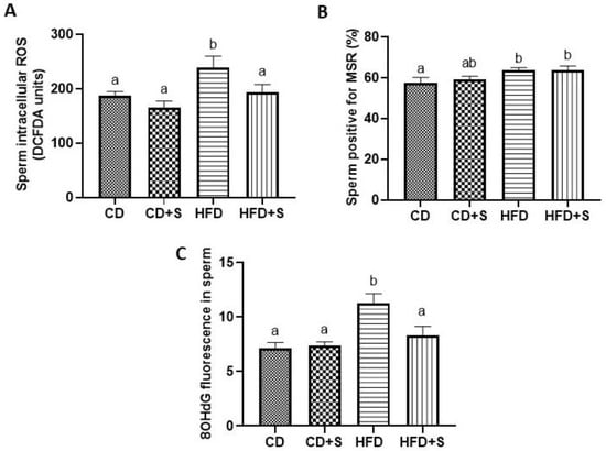 3.3. Short-Term Micronutrient Supplementation Reduces Intracellular Sperm ROS Concentrations and Oxidative DNA Damage in Males Fed a HFD