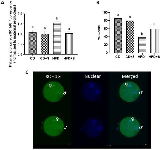 3.4. Short-Term Micronutrient Supplementation Reduces Oxidative DNA Damage in the Early Pronuclear Embryo and Increases 2-Cell Cleavage Rates from Males Fed a HFD
