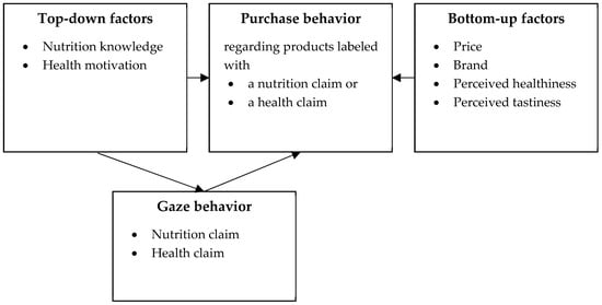 The designated roles of nutrition knowledge and health motivation as part of the ELM, with their influence on visual attention and purchase decision, can be comprised under the term ‘top-down factors’, which represent the characteristics of the consumer. Accordingly, there are also ‘bottom-up factors’ representing the characteristics of the product [94], which include consumers’ perception of the product guided by its characteristics and attributes [95]. In the present study, we included the following bottom-up factors in the analysis: Price, brand, perceived tastiness, and healthiness, as these aspects are among the most important factors for the purchase of food [59,60,62]. The conceptual model of this study is depicted in Figure 1.