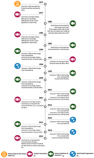 The “diet-heart hypothesis”, which postulates that diets high in saturated fat cause CVD [31], is a paradigm that has influenced U.S. national dietary guidelines since their establishment (Figure 1) [6]. Looking back at the 1977 dietary goals for the U.S. [32], dairy fat has historically been targeted because of its high content of saturated fat, prompting public health authorities to caution against consuming full-fat dairy products (Figure 1). Since then, U.S. dietary guidelines have remained steadfast in their recommendation to substitute fat-free or low-fat dairy for higher-fat dairy products [6]. Mounting evidence, however, supports that the “diet-heart hypothesis” is an oversimplification of dietary saturated fat and that health effects of saturated fat are considerably dependent upon other important factors, such as food source and matrix [33], the overall dietary pattern of an individual, and the health status of the individual [34,35]. Paradoxically, despite a more thorough understanding of the heterogenous health effects of dietary SFA, dietary guidelines outside of the U.S. also continue to discourage full-fat dairy products (Figure 1). For example, Canada’s recently released 2019 food guide discourages the consumption of higher-fat containing dairy products [9]. Furthermore, in 2018, the World Health Organization recommended the consumption of reduced-fat dairy for the first time [8].