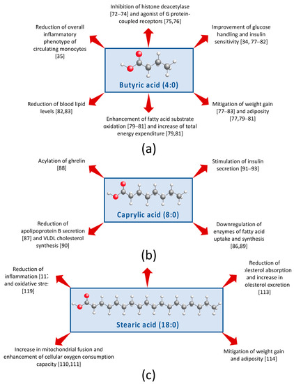 Graphical summary of the potential mechanisms of (a) butyric acid, (b) caprylic acid, and (c) stearic acid that beneficially modulate risk of metabolic syndrome.
