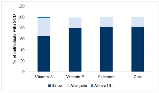 Despite the low consumption of vitamins A and E, most SCD patients were not deficient in these nutrients, perhaps because these are fat-soluble vitamins stored in the body. Thus, 24 h dietary recalls may not directly reflect the nutritional status of these nutrients. However, the median values observed in Table 3 for these vitamins are close to the cutoff point used. The mean vitamin A concentration was 0.5 µmol/L, while the cutoff point was 0.35 µmol/L, which is the lowest cutoff point used by WHO to determine vitamin A deficiency. For vitamin E, the median was 7.9 µg/mL, while the cutoff used was 5 µg/mL.
