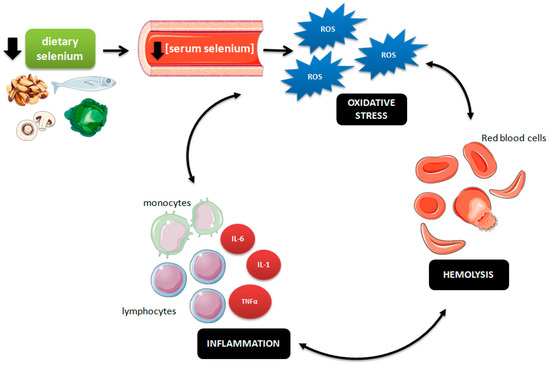 Representative scheme of the relationship between low dietary selenium intake, serum selenium concentration, and the oxidative–hemolysis–inflammation cycle in sickle cell disease (SCD) patients. ROS (reactive oxygen species), IL-1 (interleukin 1), IL-6 (interleukin 6), TNFα (tumor necrosis factor α).