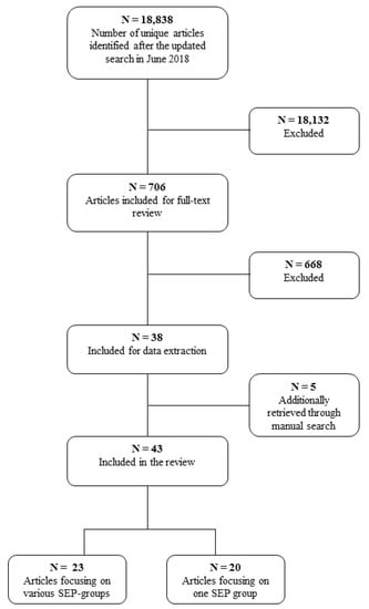 After removal of duplicates, 18,838 articles were screened on the basis of title and abstract. A total of 18,132 records were excluded after reading title and/or abstract, leaving 706 articles for full-text screening. A further 668 articles were excluded on the basis of inclusion/exclusion criteria. Based on the reference lists of the thirty-eight studies included for data extraction, five additional papers were identified. Most exclusions were done because authors did not present food environment-diet associations by SEP, but only associations between the food environment and dietary behavior adjusted for SEP as covariate. A total of forty-three papers were included in the review, of which twenty-three studied the association between aspects of the food environment and dietary behavior across different SEP strata (Table 2) and twenty studied this association in a single SEP group (Table 3). The study selection flowchart is presented in Figure 1.