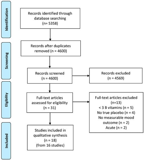 The primary focus of this review was to evaluate the effects of B vitamin supplementation on mood. In accordance with Preferred Reporting Items for Systematic Reviews and Meta-Analyses (PRISMA) guidelines, to limit heterogeneity between the included studies, the following inclusion criteria were used. To be considered for selection, trials had to be randomized, double-blind, placebo-controlled trials and had to report on a mood outcome (including stress, well-being, and fatigue). Additionally, the mood outcome must have been quantifiable, which means any change could be measured over the course of the intervention period. Studies that examined incidence of clinical mood disorders were excluded.