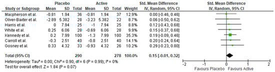 Meta-analysis was conducted on nine studies measuring depressive symptoms, which revealed no benefit of supplementation (see Appendix A). The I2 statistic indicated considerable heterogeneity (I2 = 95%, p < 0.01). Inspection of funnel plots revealed two extreme outliers (one favouring placebo, one favouring supplementation). Upon removing outliers, the test was homogenous (I2 = 0%, p < 0.99). Meta-analysis revealed that supplementation reduced depressive symptoms. However, the test failed to reach significance (n = 568, SMD = 0.15, 95% CI = −0.01, 0.32, p = 0.07) (Figure 2).