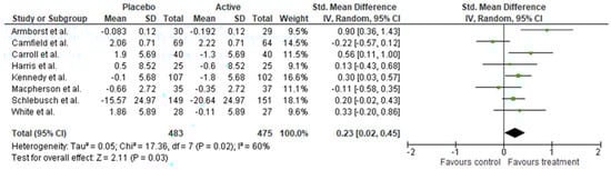 A measure of stress was included in 10 studies, with seven of these studies utilising the Perceived Stress Scale (PSS). Three of these found positive effects of supplementation by decreasing subjective stress. An additional three studies found benefits of B vitamin supplementation on stress using the BSI and PSQ [,,]. In total, six of the 10 studies measuring stress found a benefit of supplementation. Meta-analysis revealed supplementation reduced stress symptoms (n = 958, SMD = 0.23, 95% CI = 0.02, 0.45, p = 0.03) (Figure 3). However, there was moderate heterogeneity across measures (I2 = 60%) and chi-square was violated (p = 0.02).