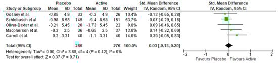 Ten studies included a measure of anxiety. Two studies found benefits to anxiety symptoms following short supplementation periods (28–30 days) ([] and []). Another study found a benefit of supplementation in a sub-group of participants who had a poor anxiety status at baseline []. Lastly, Pipingas, Camfield, Stough, Cox, Fogg, Tiplady, Sarris, White, Sali, Wetherell and Scholey [] found a significant benefit of supplementation in a male subgroup only. The remaining studies found no benefit of B vitamins over a placebo. Meta-analysis revealed supplementation had no benefit for stress symptoms (n = 562, SMD = 0.03, 95% CI = −0.13, 0.20, p = 0.71, see Figure 4).