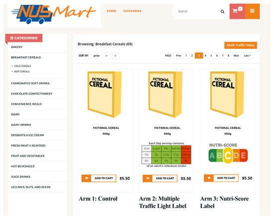 NUSMart is an online experimental grocery store developed by the study team and used to run the present trial (https://nusmart.duke-nus.edu.sg/NM). At the time of the trial, NUSMart contained over 4,000 products commonly purchased in local supermarkets (food and beverages only) in Singapore. Food and beverage items are sorted into various categories, such as dairy products, carbonated soft drinks, fresh meats and seafood, and snacks. Participants are able to add and remove products to and from their online grocery cart and review their cumulative total cart cost. The online grocery store was designed to mirror actual online grocery stores available in Singapore such as Fairprice Online (https://www.fairprice.com.sg/) and RedMart (https://redmart.lazada.sg/#home) in look and feel. All products include pictures of the item, retail prices and product descriptions. Nutrition Information Panels and product information are available on click-through.