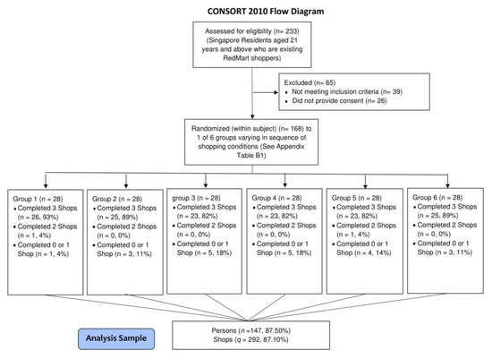 The study was a crossover trial where all participants were exposed once to three shopping conditions in random order. Participants were randomly assigned to one of six intervention sequences via random permuted blocks of size three with equal allocation for the six sequences (see Appendix A Table A8) by a computer program. Participants were blinded to intervention allocation, which was allocated via the NUSMart system. Allocation results were recorded within NUSMart and all investigators were blinded to group allocation.