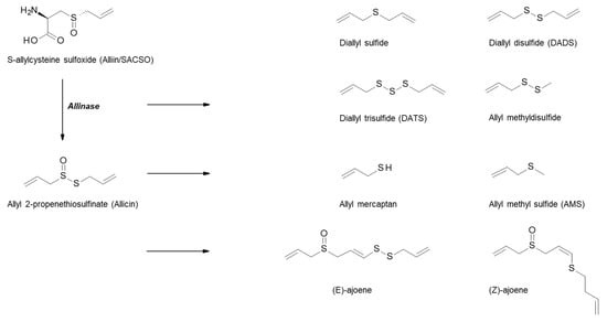 Alliaceous vegetables, including garlic, onions, leeks and shallots, are rich in a variety of bioactive compounds, such as flavonols, oligosaccharides, selenium, arginine and organosulfur compounds (OSCs), the latter being of most interest with regards to health benefits, especially in relation to cancer. The OSCs within Allium vegetables are responsible for their characteristic odour and flavour and comprise approximately 1% dry weight of garlic and 0.5% dry weight of onions. The S-alk(en)yl-L-cysteine sulfoxides (SACSOs) are the main sulfur-containing constituents within allium vegetables, and are precursors to the bioactive components. Alliin (S-allylcysteine sulfoxide) is the major SACSO found in garlic, and isoalliin (trans-(+)-S-(propen-1-yl)-L-cysteine sulfoxide) is the predominant SACSO in onions [37,38,39]. When garlic is cut, chopped, or crushed, the disruption of the cell membranes causes the transformation of SACSOs to sulfenic acid intermediates by the enzyme alliinase, which is released from the vacuoles of the plant as part of its defence system. These intermediates are highly reactive and rapidly produce thiosulfinate compounds via condensation reactions (Figure 2). Allicin (thio-2-propene-1-sulfinic acid S-allyl ester) is the major garlic thiosulfinate, and due to its unstable nature, is rapidly broken down to further compounds such as ajoene, vinyldithiins, and sulfides including diallyl sulfide (DAS), diallyl disulfide (DADS), and diallyl trisulfide (DATS) [46].