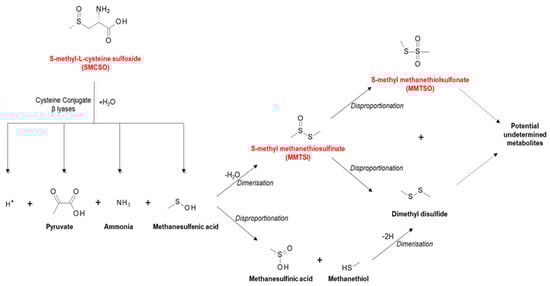 S-methyl-L-cysteine sulfoxide (SMCSO) metabolism. Schematic outlining the breakdown of SMCSO initially by specific cysteine conjugate β lyases leading to secondary bioactive products through dimerization and disproportionation reactions. Highlighted in red are the sulfur-containing metabolites with potential undetermined biological activity [57].