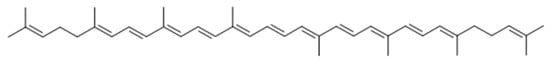 Lycopene is the most abundant carotenoid found in tomatoes, and accounts for >85% of all dietary sources [59]. It is a 40-carbon atom, acyclic open-chain hydrocarbon containing 11 conjugated and 2 non-conjugated double bonds, assigned in linear array building a chromatophore (Figure 4). These double bonds allow for potential extensive isomerisation, which could theoretically result in 1056 cis–trans configurations [60]. Despite this, there are only a few isomers found in nature, the most prevalent being the all-trans-isomer (the all-trans and 5-cis isomers being the most thermodynamically stable configurations). Isomerisation from trans-isomer to various other forms can occur secondary to heat, light, and chemical reactions or secondary to in vivo mechanisms [61,62].