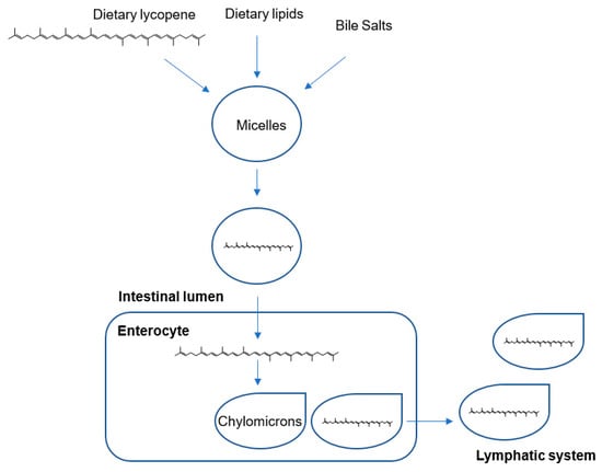 Lycopene is passively absorbed in the small intestinal mucosa via integration into dietary lipid micelles, along with other lipids and bile acids. Micelles are transported from the enterocyte to the liver in the form of chylomicrons in lymphatic fluid, prior to transportation in the plasma to target organs via low-density and very-low-density lipoproteins (Figure 5). The absorption of lycopene ranges between 10%–30% and is dependent upon many factors, including age, smoking, alcohol consumption and dietary composition [66,67]. Importantly, the lipid-soluble nature of lycopene means that its bioavailability is vastly increased by consuming it with fat [68]. Lycopene appears to distribute unevenly across organs, perhaps due to differing metabolic/oxidation rates or lipoprotein receptor numbers [69,70], however, lycopene preferentially accumulates to maximal concentrations in the testes, adrenal glands, liver and prostate [66,70].