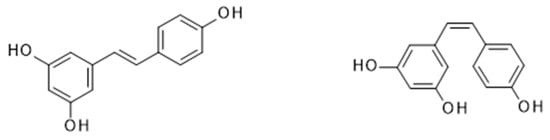 Resveratrol (trans-3,5,4’-trihydroxystilbene) is a stilbenoid polyphenol belonging to the phytoestrogens. Two isomeric forms of resveratrol exist; the trans- isomer is the most stable and biologically active form, whereas the cis- isomer is formed following the breakdown of the trans- form secondary to the action of UV light or high-pH conditions during fermentation (Figure 6). Both isomeric forms of resveratrol can be found in variable concentrations in grapes, as well as several fruits including tomatoes, raspberries, blueberries and mulberries. The highest concentration of resveratrol is found in the skin of black and red grapes (50–100 µg/g), and thus, red wine, and to a lesser degree in white and rosé wines. Commercially available wines have been shown to contain a concentration of resveratrol in the range of 0.1–14.3 mg/L [85,86], with the Pinot Noir grape varieties containing the highest concentrations of trans-3,5,4′-trihydroxystilbene [87]. Resveratrol is also found in cocoa and chocolate to a lesser degree (1.85 ± 0.43 µg/g and 0.35 ± 0.08 µg/g, respectively) [85,86,88].