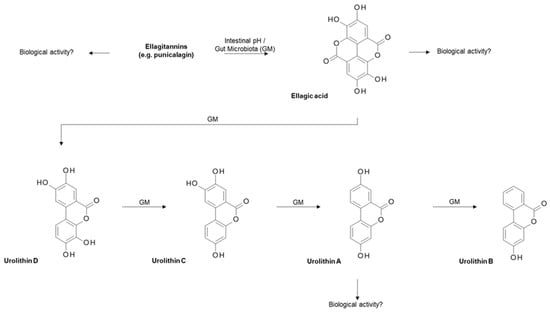 Metabolism of ellagitannin within pomegranate. Briefly, ellagitannins such as punicalagin are metabolised by intestinal pH and/or gut microbiota (GM) to give ellagic acid, which is further broken down by gut microbiota to give various urolithins, including urolithin A, which is biologically relevant [135].