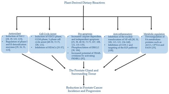The occurrence of cancer in the prostate is often associated with the development of what appear to be several apparently independent cancer foci. Recent studies have also shown that histologically “healthy” prostate tissue in ageing glands have many mutations that are often associated with carcinogenesis, which may facilitate the emergence and proliferation of cancerous clones [22]. Diet and particularly plant bioactives may be able to directly or indirectly modify the cellular environment of the prostate and inhibit the emergence of new cancer clones, in addition to preventing the proliferation of existing clones [23].