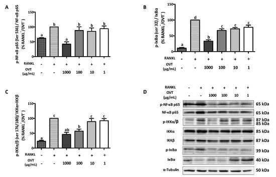 Effect of ovotransferrin on RANKL-induced NF-κB activation. RAW 264.7 cells were pretreated with ovotransferrin (1–1000 μg/mL) for 30 min prior to stimulation with RANKL (100 ng/mL). Then, RAW 264.7 cells were treated with both RANKL and ovotransferrin for 4 h. Whole cell lysates were used for Western blot analysis of (A) p-NF-κB p65 (ser 536)/NF-κB p65, (B) p-IκB (ser 32)/IκB, and (C) p-IKKα/β (ser 176/180)/IKKα+IKKβ. (D) All bands are shown. The results are expressed as means ± SEM representative of 4 independent experiments. Means with different letters indicate p < 0.05.
