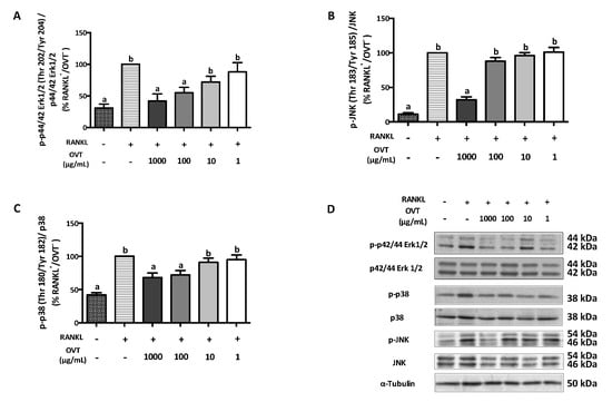 Effect of ovotransferrin on RANKL-induced MAPK activation. RAW 264.7 cells were pretreated with ovotransferrin (1–1000 μg/mL) for 30 min prior to stimulation with RANKL (100 ng/mL). Then, RAW 264.7 cells were treated with both RANKL and ovotransferrin for 4 h. Whole cell lysates were used for Western blot analysis of (A) p-p44/42 Erk1/2 (Thr 202/Tyr 204)/p44/42 Erk1/2, (B) p-p38 (Thr 180/Tyr182)/p38, and (C) p-JNK (Thr 183/Tyr 185)/JNK. (D) All bands are shown. The results are expressed as means ± SEM representative of 4 independent experiments. Means with different letters indicate p < 0.05.