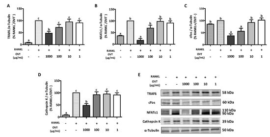 Effect of ovotransferrin on RANKL-induced expression of proteins involved in osteoclastogenesis. RAW 264.7 cells were pretreated with ovotransferrin (1–1000 μg/mL) for 2 h prior to stimulation with RANKL (100 ng/mL). Then, RAW 264.7 cells were co-cultured with RANKL and ovotransferrin for 12 h. Whole cell lysates were used for Western blot analysis of (A) TRAF6, (B) cFos, (C) NFATc1, and (D) cathepsin K. (E) All bands are shown. The results are expressed as means ± SEM representative of 4 independent experiments. Means with different letters indicate p < 0.05.